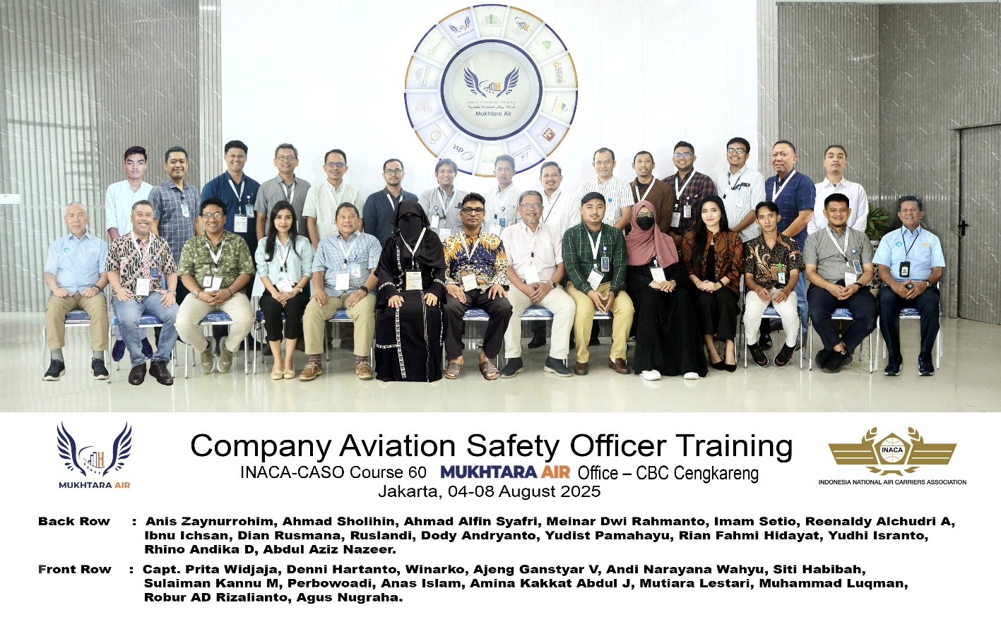 Tim training INACA kembali melaksanakan In-house training Company Aviation Safety Officer [CASO] Course 60 pada tanggal 04-08 Agustus 2025. In-house training kali ini bekerjasama dengan Mukhtara Air dan diselenggarakan di Cengkareng Business Center (CBC), Kota Tangerang, Banten.