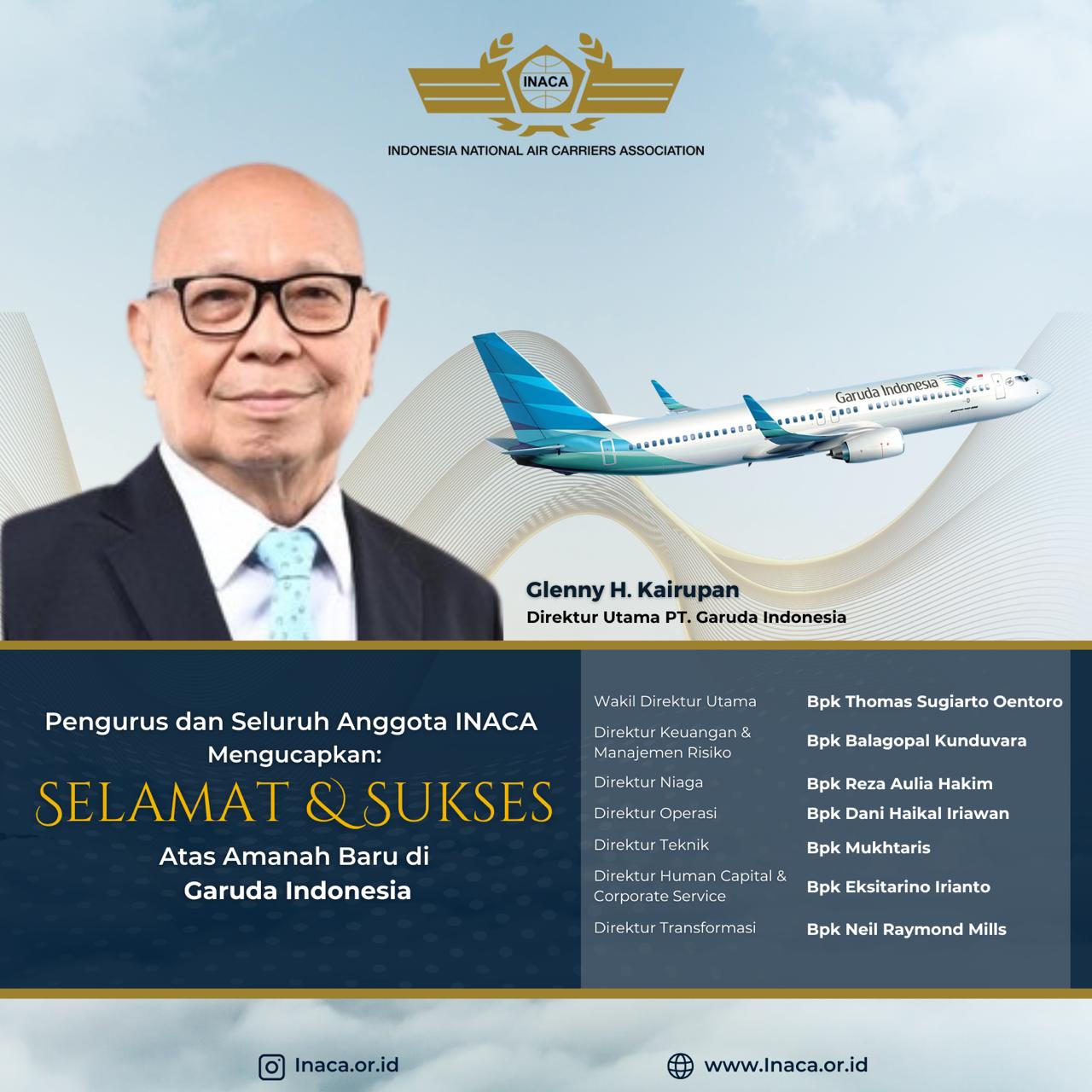 Pengurus dan seluruh anggota Indonesia National Air Carriers Association (INACA) menyampaikan selamat dan sukses kepada Bapak Glenny H. Kairupan atas amanah barunya sebagai Direktur Utama PT Garuda Indonesia (Persero) Tbk.