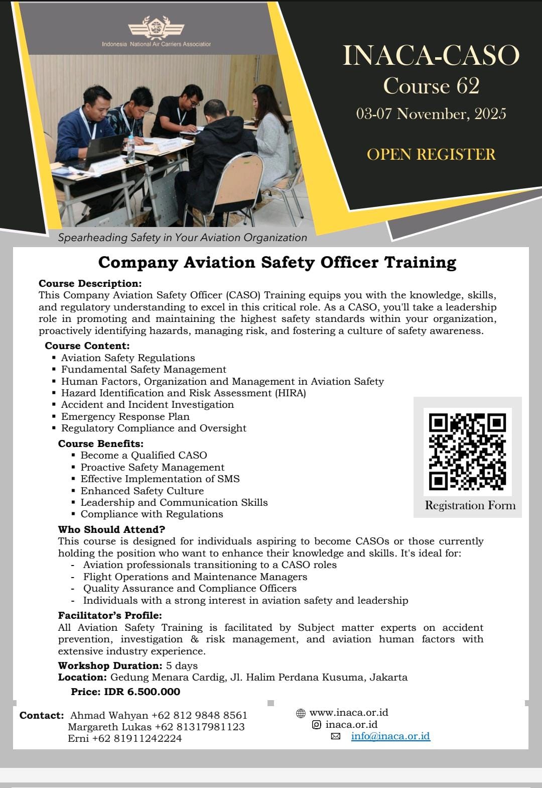 1. Company Aviation Safety Officer (CASO) Course 62, dijadwalkan mulai hari Senin, 03 November sampai dengan Jumat, 07 November 2025.